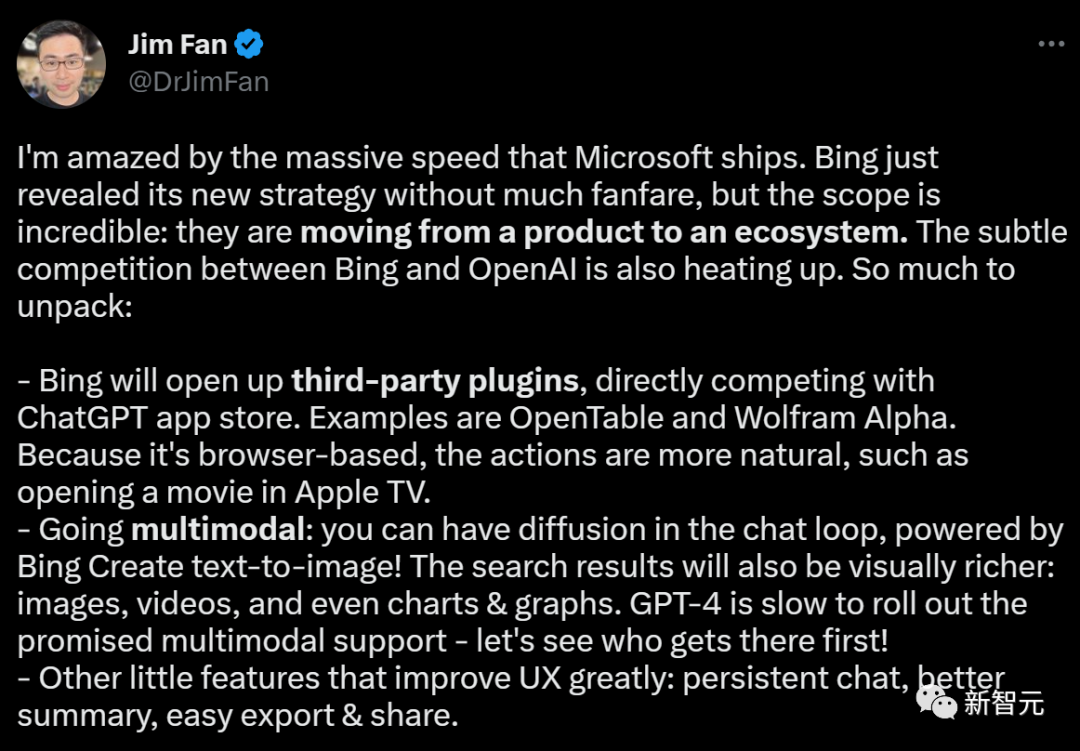 Jim Fan认为,全新的Bing不仅仅是一个产品那么简单,更像是一种生态。与此同时,微软和OpenAI的竞争也慢慢升温了。