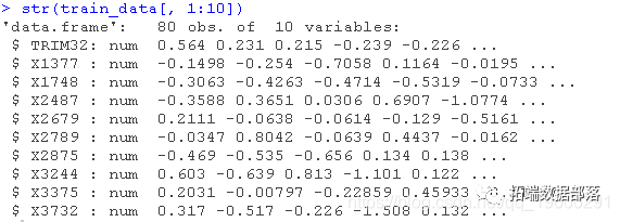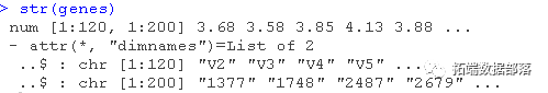 genes: 一个120×200的矩阵,包含120个样本(行)的200个基因的表达水平(列)。trim32: 一个含有120个TRIM32基因表达水平的向量。##查看刚刚加载的对象