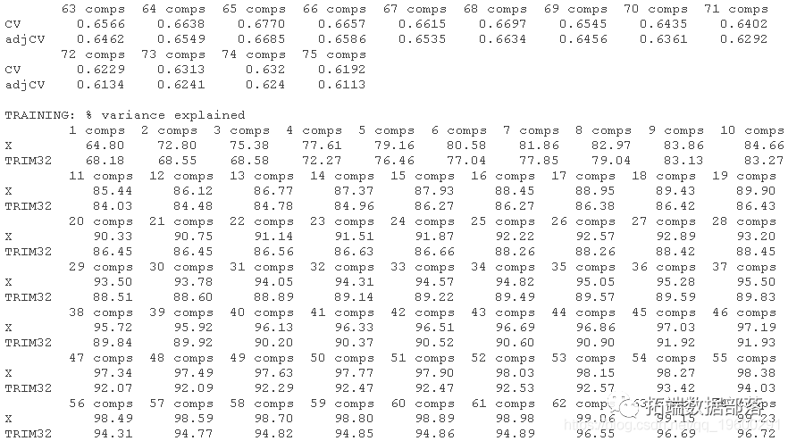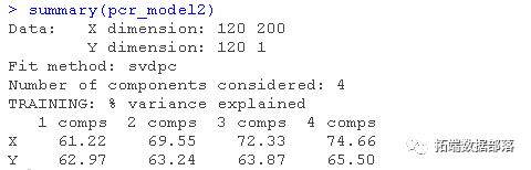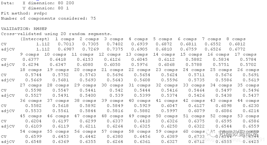 首先,输出显示了数据维度和使用的拟合方法。在本例中,是基于SVD的主成分PC计算。summary()函数还提供了使用不同数量的成分在预测因子和响应中解释方差的百分比。例如,第一个PC只解释了所有方差的61.22%,或预测因子中的信息,它解释了结果中方差的62.9%。请注意,对于这两种方法,主成分数量的选择都是任意选择的,即4个。