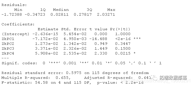 输出结果显示,PC1和PC4的β估计值与0相差很大(在p<0.05),但是结果不能轻易解释,因为我们没有对PC的直接解释。