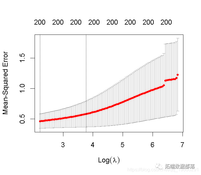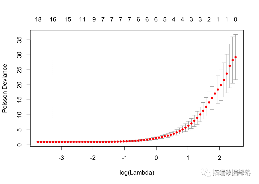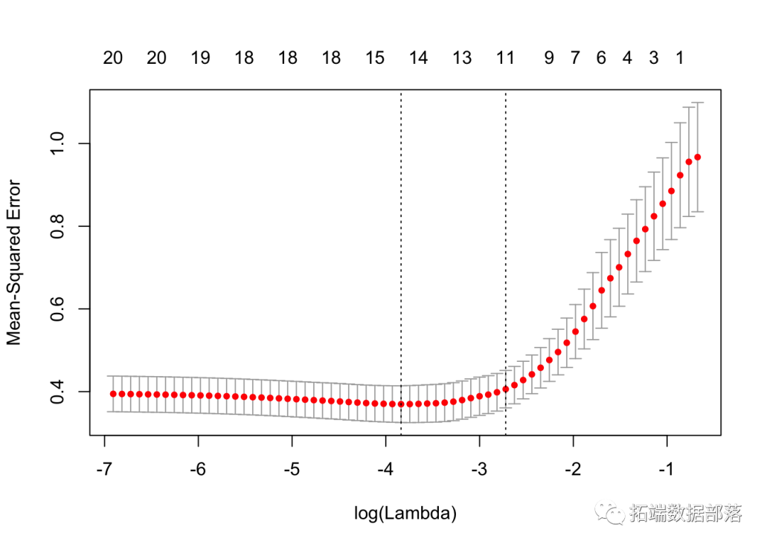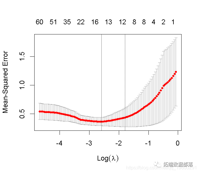lambda.min: 给出交叉验证最佳结果的γ值。lambda.1se: γ的最大值,使MSE在交叉验证的最佳结果的1个标准误差之内。