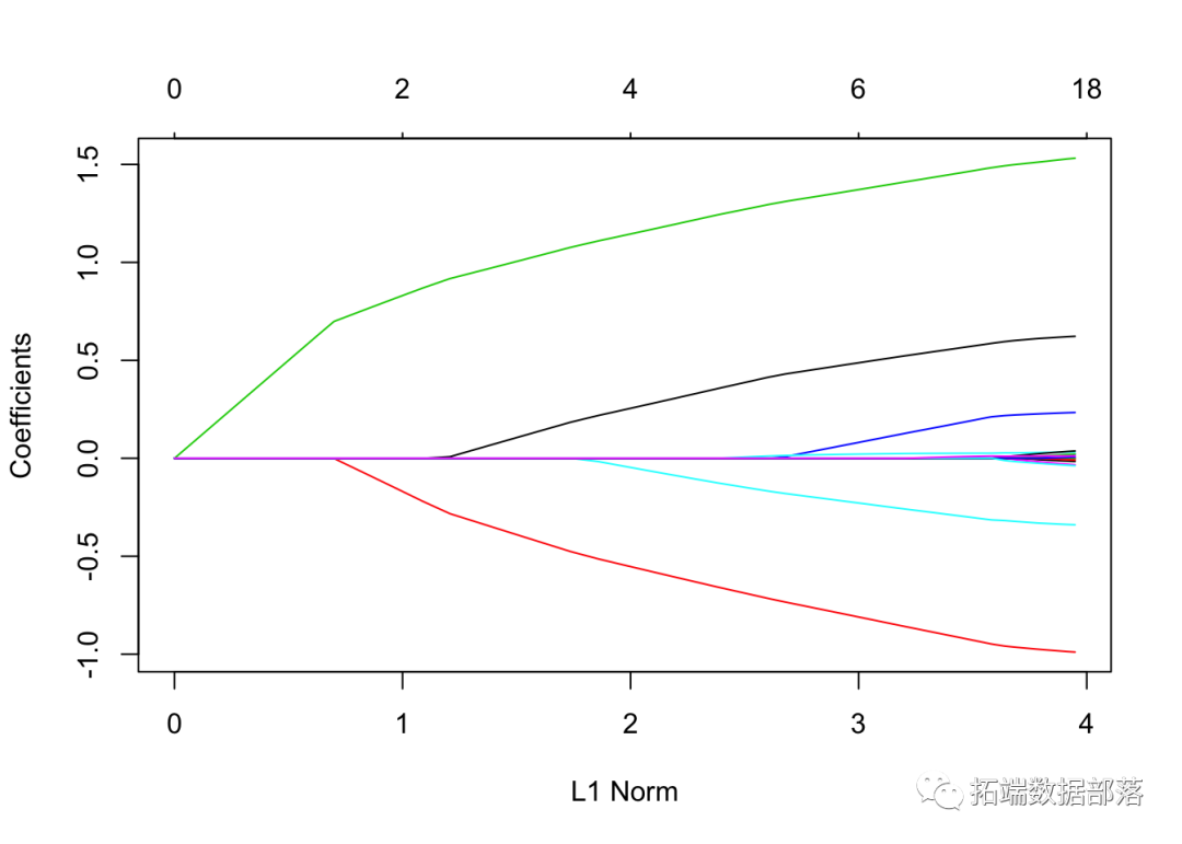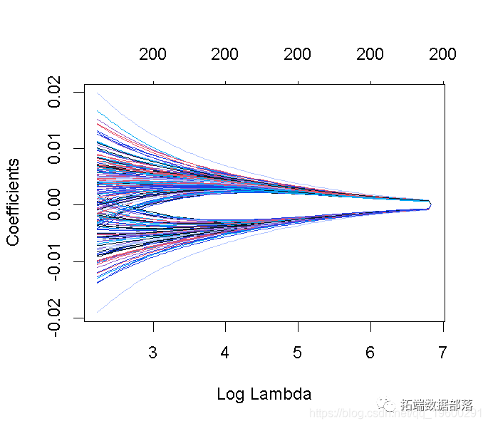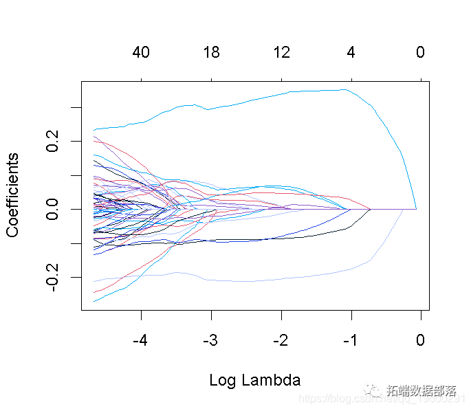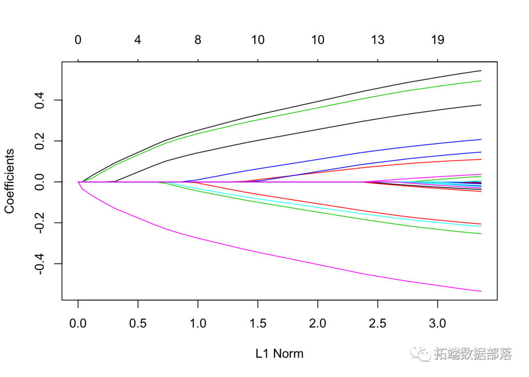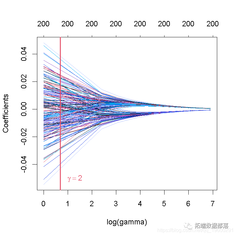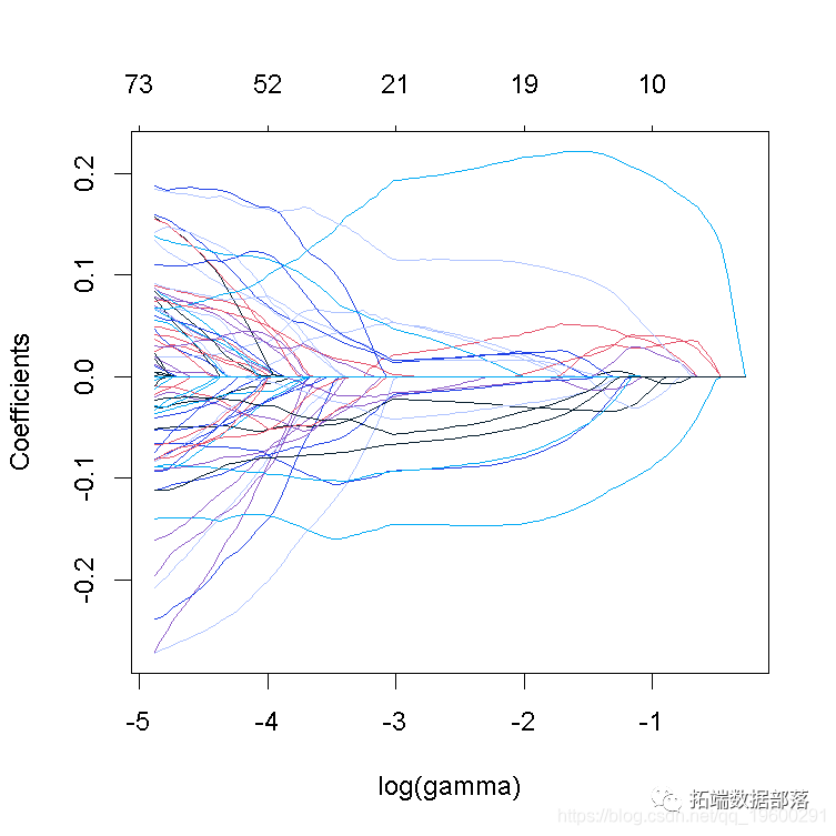 这张图被称为系数曲线图,每条彩线代表回归模型中的一个系数β^,并显示它们如何随着γ(对数)1值的增加而变化。