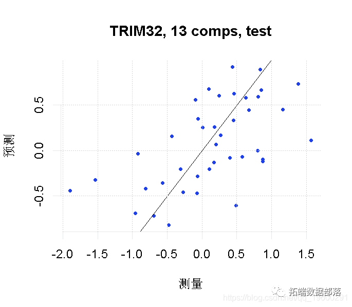 最后,我们将我们的因变量(TRIM32基因表达)的预测值与我们测试集的实际观察值进行对比。