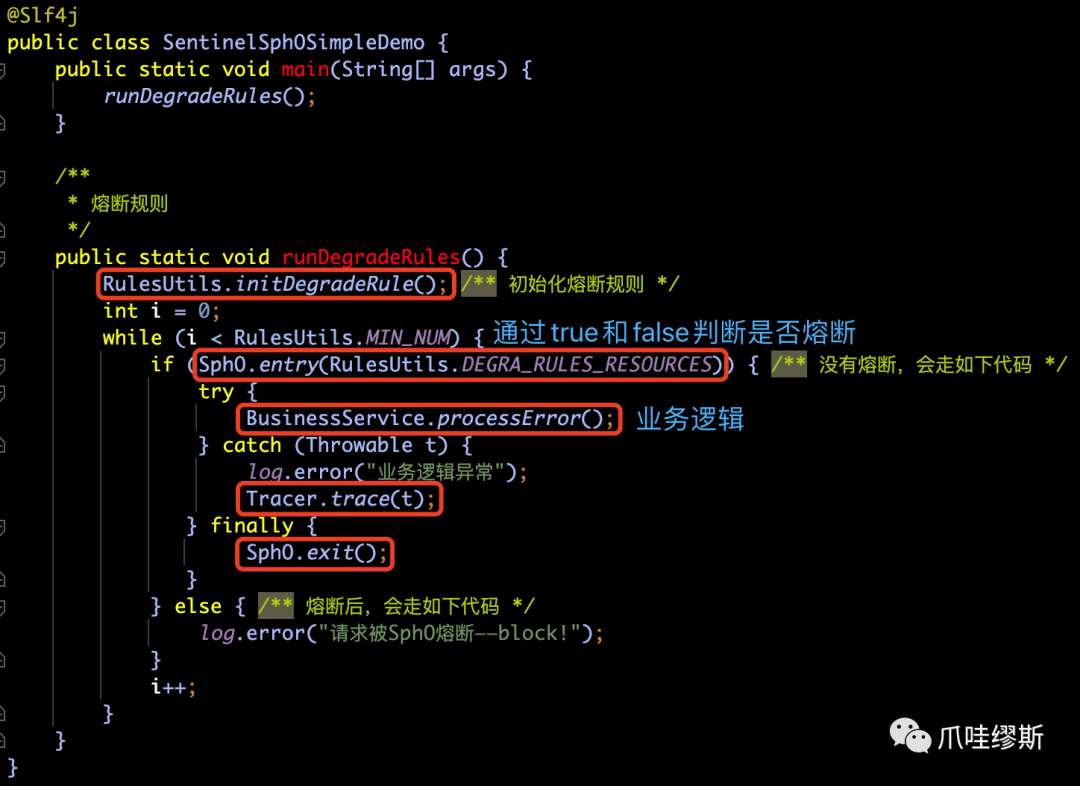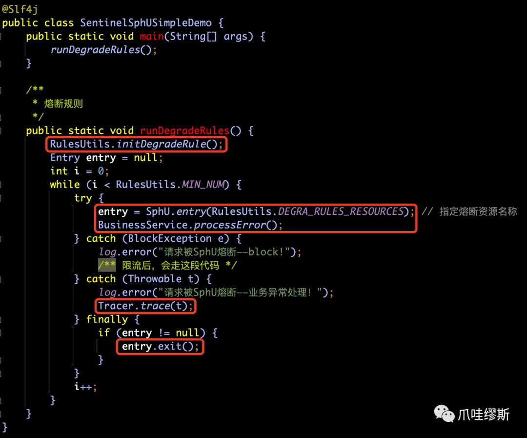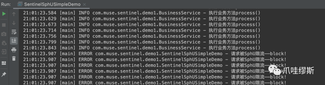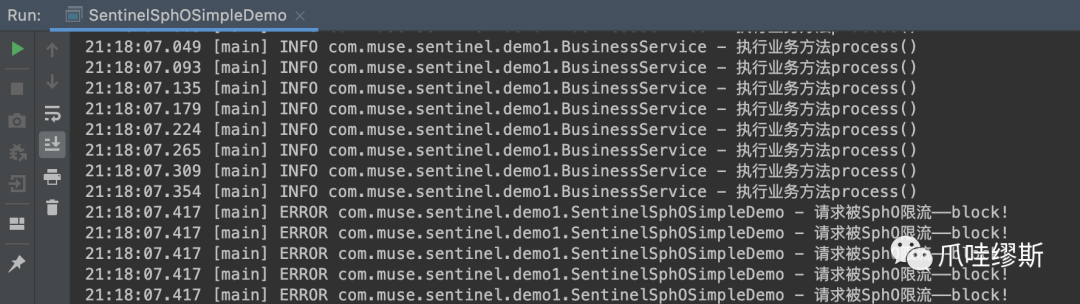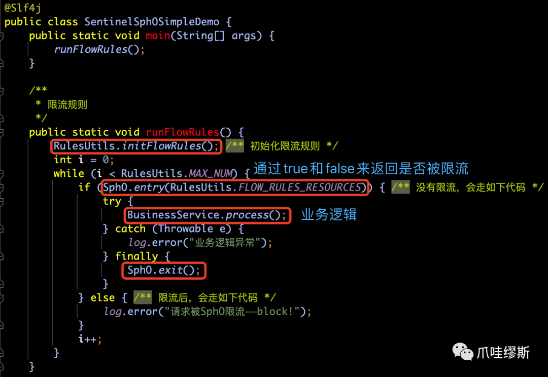 SphU.entry("process") 和 entry.exit() 包围起来即可(SphO也是一样的)。当然,也支持注解形式——@SentinelResource,注解方式后续我们会介绍到。SphU.entry时,如果资源被限流/熔断后,会抛出一个BlockException,然后在捕获异常后进行限流的逻辑处理。SphO.entry时,如果资源被限流/熔断后,会返回false。然后在else判断后进行限流的逻辑处理。SphO.entry时,需要资源使用完之后调用SphO.exit(),否则会导致调用链记录抛出ErrorEntryFreeException异常。