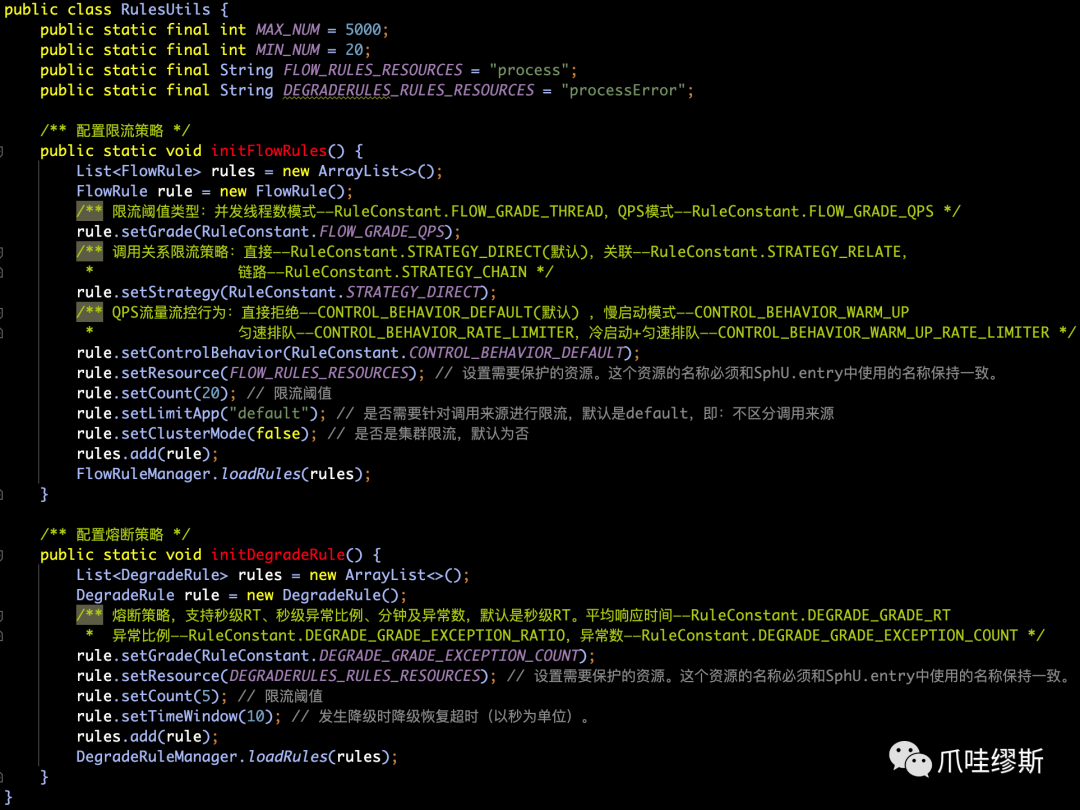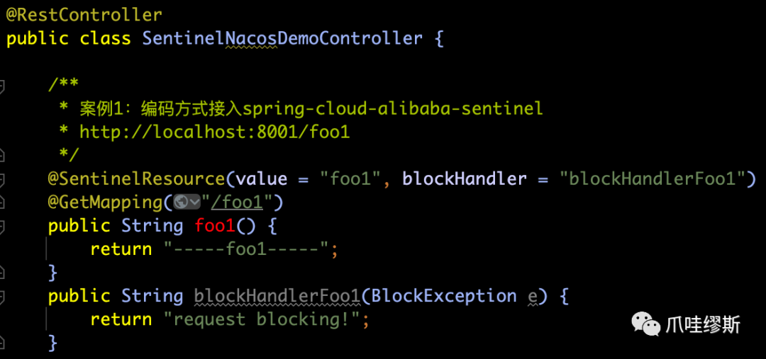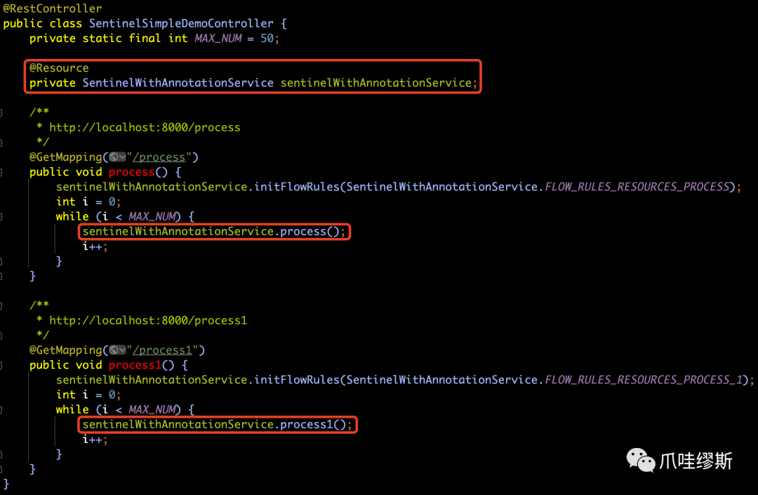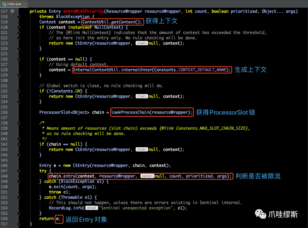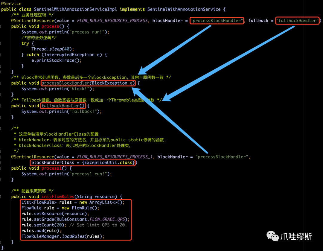 SphU.entry("process") 和 entry.exit() 包围起来即可(SphO也是一样的)。当然,也支持注解形式——@SentinelResource,注解方式后续我们会介绍到。SphU.entry时,如果资源被限流/熔断后,会抛出一个BlockException,然后在捕获异常后进行限流的逻辑处理。SphO.entry时,如果资源被限流/熔断后,会返回false。然后在else判断后进行限流的逻辑处理。SphO.entry时,需要资源使用完之后调用SphO.exit(),否则会导致调用链记录抛出ErrorEntryFreeException异常。