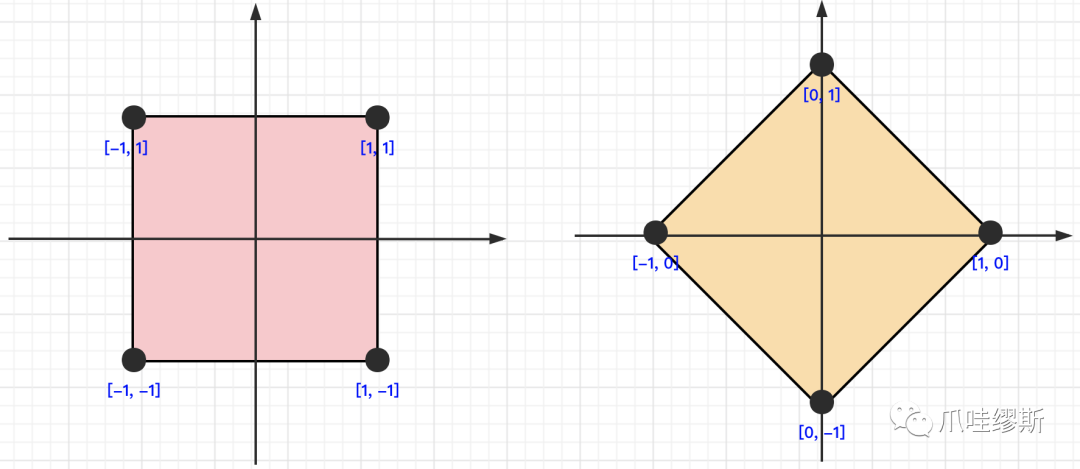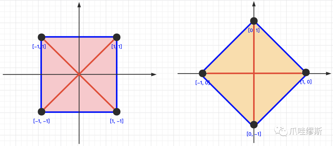 根据题意,会传入四个点的x轴和y轴的坐标。由于四个点的坐标都是整形,并且输入也不是按照任何顺序给出的。那么我们可以假设有如下集中正方形图形。一个是“端正”的正方形图形,另一个是有“旋转”的正方形图形。对于有旋转的正方形,我们求其对角线就会很方面,通过节点[-1, 0]与节点[1, 0]之间x轴相减并取绝对值即可;在通过节点[0, 1]与节点[0, -1]之间y轴相减并取绝对值即可;但是,对于“端正”正方形却无法采用这种方式。具体情况如下图所示: