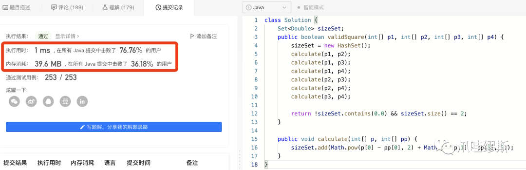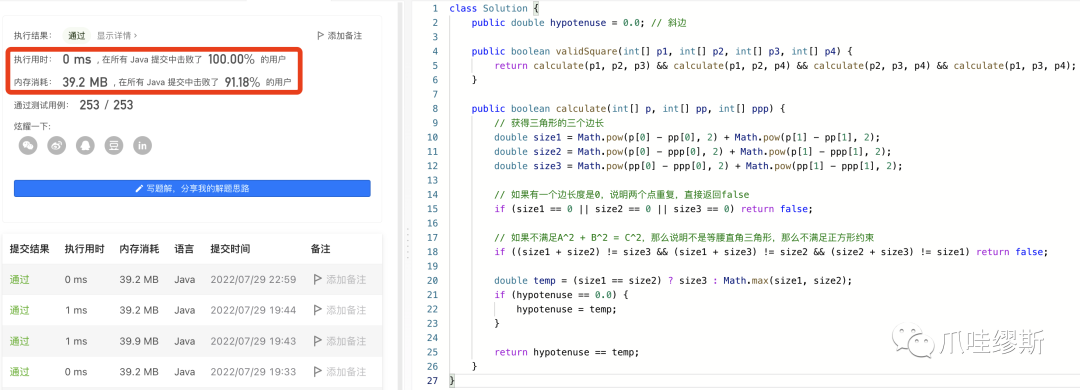 确定了解题方向之后,我们也要像思路1一样,提供一个方法,这是这个方法是用于计算两个节点之间的距离,也就是边长。这个方法需要传入两个节点的坐标。不过在思路1和思路2中,需要注意一点,就是要判断重复节点,比如极端情况下,四个节点都是相同的,例如:A[0, 0] ,B[0, 0],C[0, 0],D[0, 0]。这种解题实现代码会比思路1少很多,而且逻辑会更简单。具体代码实现请移步至——4.2> 实现2:正方形边长验证法