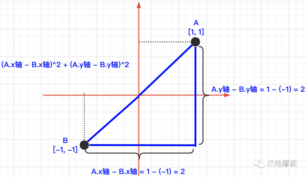 计算两个点之间的距离,我们可以采用(A.x轴 - B.x轴)^2 + (A.y轴 - B.y轴)^2结果开根号,由于我们只是去对比边或者对角线是否相同而并非要具体的值,那么我们就直接使用(A.x轴 - B.x轴)^2 + (A.y轴 - B.y轴)^2值来对比即可,不需要再开根号了。
