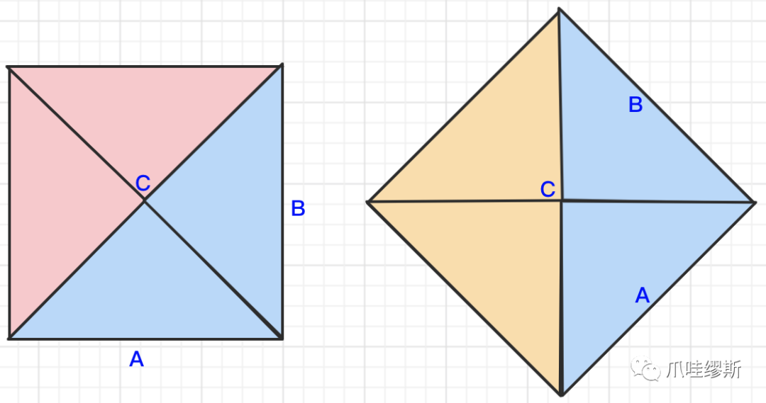 针对正方形,我们其实可以将其拆分成四个等腰直角三角形,如下图所示,A^2 + B^2 = C^2,并且对于其他等边也具有相同的等式,并且对于正方形的对角线也都应该是相同的。所以,我们提供一个验证是否合法的方法,传入3个节点的坐标int[] p, int[] pp和int[] ppp,分别计算这3个节点之间的距离(即:边长),与其他两条边长的长度不相等的就是对角线长度了。我们再计算其他3个节点的对角线长度,如果对角线都相同,则说明是正方形,否则,就不是有效的正方形。