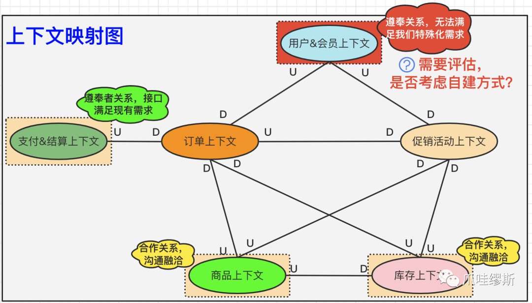 首先,在绘制上下文映射图的过程中,可以促使你更好的分离限界上下文,并识别出语言边界。可以更清楚的识别出当前项目中的限界上下文和其依赖的限界上下文之间的关系。
