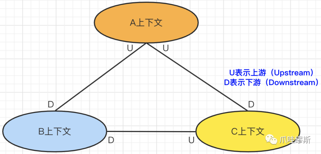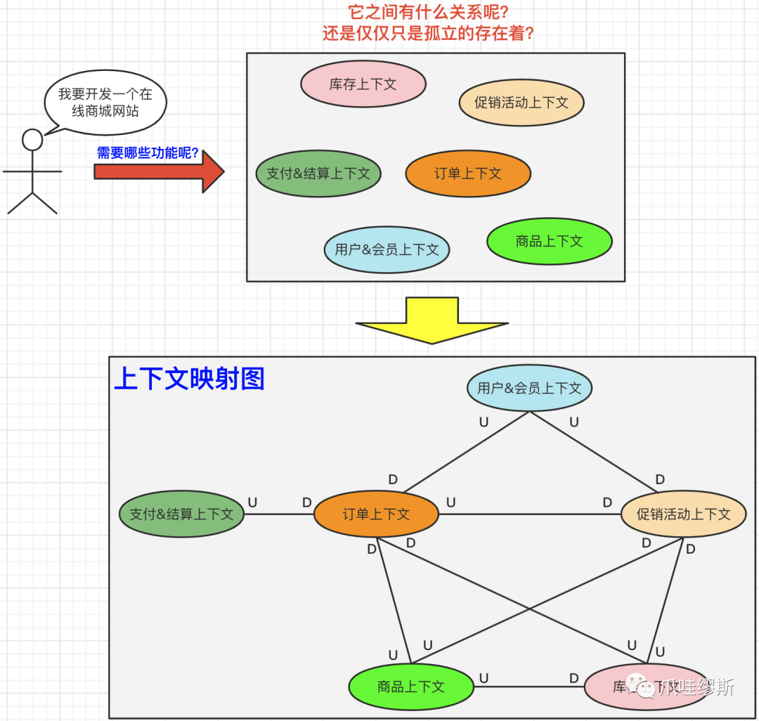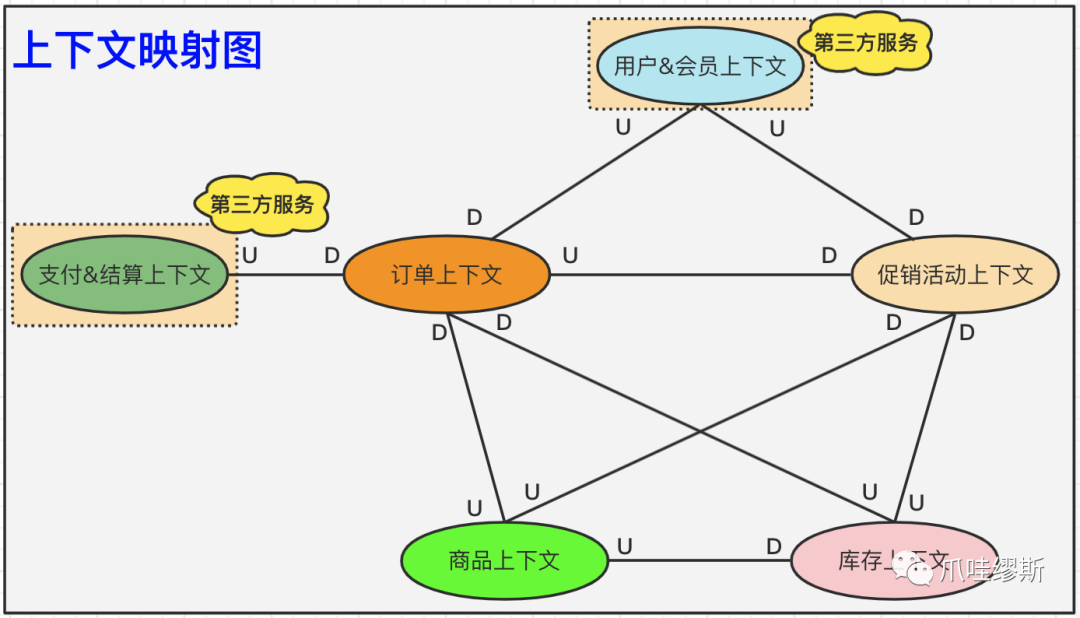 【解释】图中的字母U(上游:UpStream)和字母D(下游:DownStream)显式地指出了限界上下文之间的关系。有了这些字母标签,上下文在图中的位置关系就不那么重要了,但是,这些位置关系依然能给我们营造一种好的视觉效果。