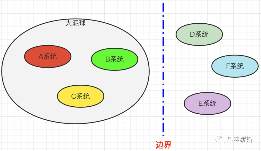一般来说,如果我们负责的是一个全新开发的系统,那么它的边界和上下文一般都会比较清晰。而对于遗留系统,或者发展了好几年的老系统来说,它内部的边界一般来说都是比较模糊的,而面对这种大泥球系统,才是我们日常开发中经常会遇到的情况。那么,当我们遇到这种情况后,怎样去做呢?首先,不用试图去使用复杂的建模手段来化解问题,因为这样有可能会让原本轮乱的系统更复杂。其次,我们应该为整个系统绘制一个边界。这个边界是干什么用的呢?就是当我们判断一个系统或者功能属于这种“大泥球”时,就将其放到边界内,因为这样的系统有可能会向其他系统蔓延,我们应该通过这种边界来防止这种蔓延情况发生。