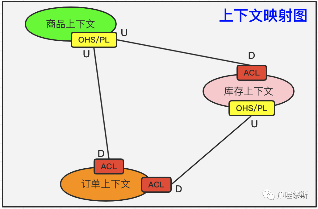 我们可以在绘制上下文映射图时,将使用的某种组织和集成关系标注上去,下面以ACL、OHS和PL为例: