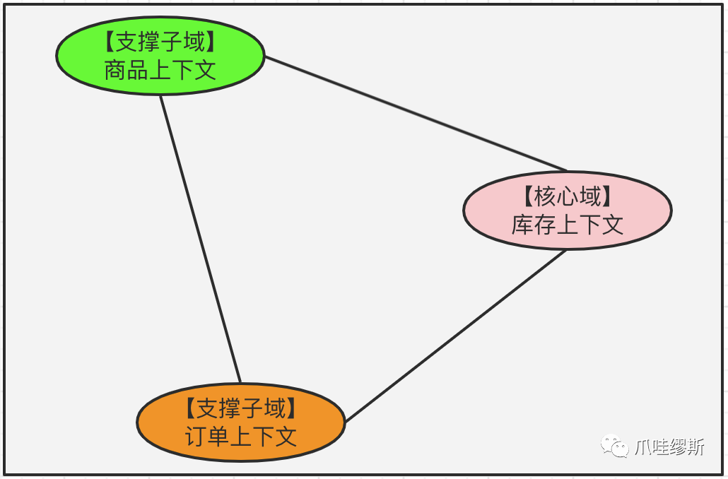 但是,随着开发迭代的进行中,我们发现,如果再这么继续下去,就会变成我们上面提到的“大泥球”了,那么这种情况,是团队任何人员都不希望发生的。所以,团队小伙伴们坐在一起,研发同学和领域专家一起商量如何对子域进行划分,以及哪些是我们的核心域。通过讨论后,大家目前将其分为了订单上下文、商品上下文、库存上下文。在这些上下文中,库存上下文中除了对商品的采购和维护之外,还包含了采购策略,商品销售趋势预测等功能,而这部分能力的高低,会直接影响到商城上面的售卖,所以,库存上下文被认定为核心域,而订单上下文和商品上下文,被确定为支撑子域。