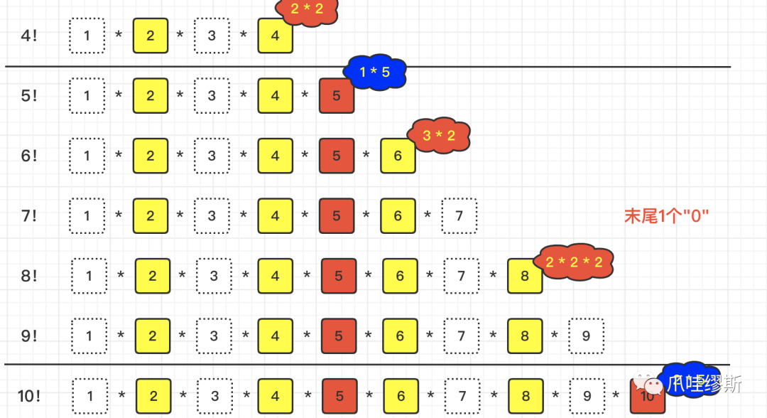 在上图中,我们可以看到,对于“2”来说,2、4、6、8这4个数,可以拆出6个“2”;对于“5”来说,5、10这2个数,可以拆出3个“5”;所以,通过上面的规律我们可以看出,2出现的次数是远远大于5出现的次数的,所以,我们就可以将规则简化为:“在一个数的阶乘中,5出现了n次,那么在结果中,末尾就会有n个0”。