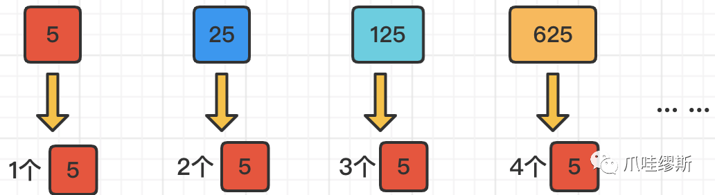 那么除了25之外,还有其他特殊的吗?当然有,比如125=5*5*5,那么就相当于出现了3次5;625=5*5*5*5,那么就相当于出现了4次5;所以,我们可以得出以下结论:在以数字n进行阶乘的时候,每隔5个数,会出现一次5,每隔25个数,会出现两次5,每隔125次,会出现三次5……,以此类推。所以,假如给我们一个数字n,它到底有多少个5,那也就相当于结果的末尾有多少个0,计算公式为:n/5 + n/25 + n/125 + N/625 + ……;其实也就是:n/5 + n/(5*5) + n/(5*5*5) + n/(5*5*5*5) + ……,具体含义如下图所示: