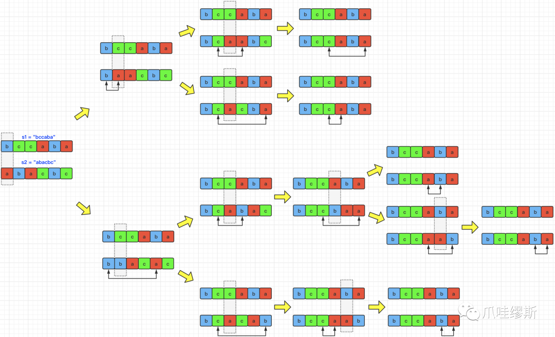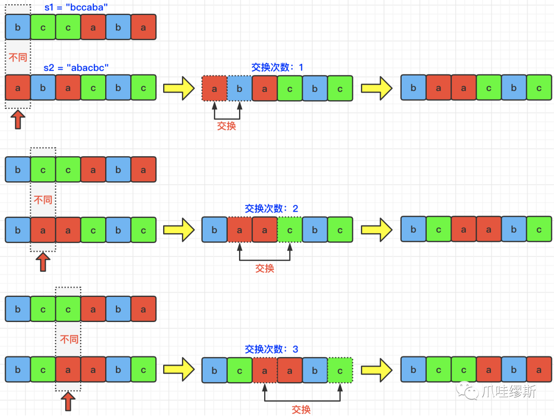 1 <= s1.length <= 20{'a', 'b', 'c', 'd', 'e', 'f'} 中的小写字母异位词根据题目描述,需要寻找最小相似度,那么这道题我们可以采用回溯算法来进行计算。每次交换都会开辟一条新的“遍历路线”,那么每当我们走完一条路线之后,就需要通过回溯来走其他路线,最终根据计算每条路线的交换次数,返回最小值即可。下面我们以s1=“bccaba”,s2=“abacba”为例,展示一条路线的交换遍历过程,如下图所示: