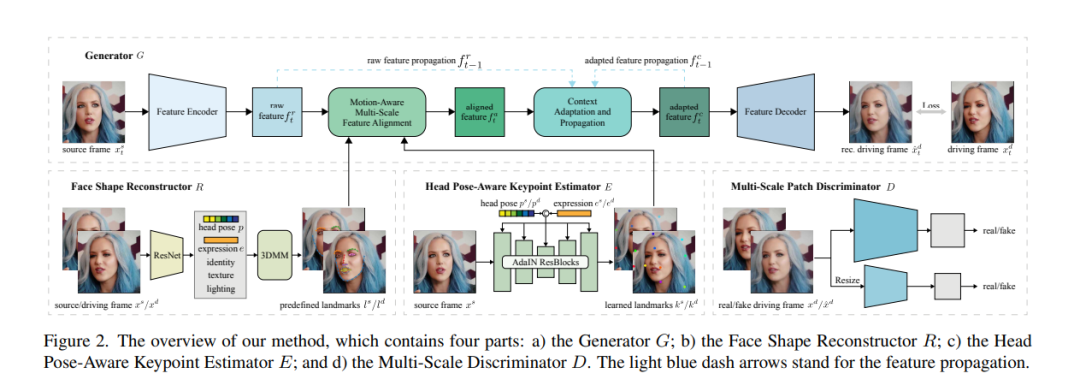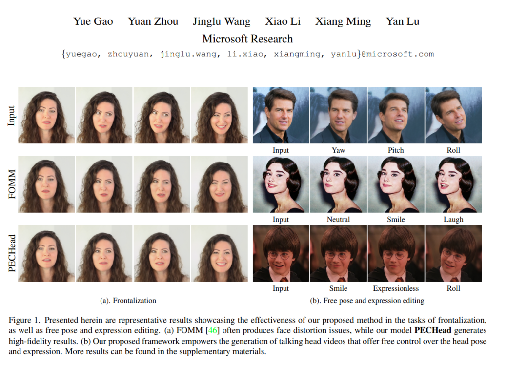 说话头生成是根据给定的源身份和目标运动生成视频。然而,目前的方法面临着一些挑战,限制了生成视频的质量和可控性。首先,生成的人脸往往存在意想不到的变形和严重的失真。其次,驾驶图像没有明确地解缠运动相关信息,如姿态和表情,这限制了在生成过程中对不同属性的操作。第三,由于相邻帧之间提取的地标不一致,生成的视频往往存在闪烁伪影。本文提出一种新的模型,可以产生高保真的头部视频,可以自由控制头部姿态和表情。该方法利用自监督学习路标和基于3D人脸模型的路标来建模运动。本文还提出了一个新的运动感知多尺度特征对齐模块,以有效地迁移运动而不产生面部失真。用特征上下文自适应和传播模块增强了合成的说话人视频的平滑性。在具有挑战性的数据集上评估了该模型,并展示了其最先进的性能。更多信息请访问https://yuegao.me/PECHead。