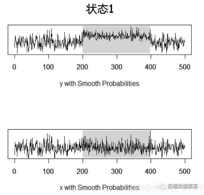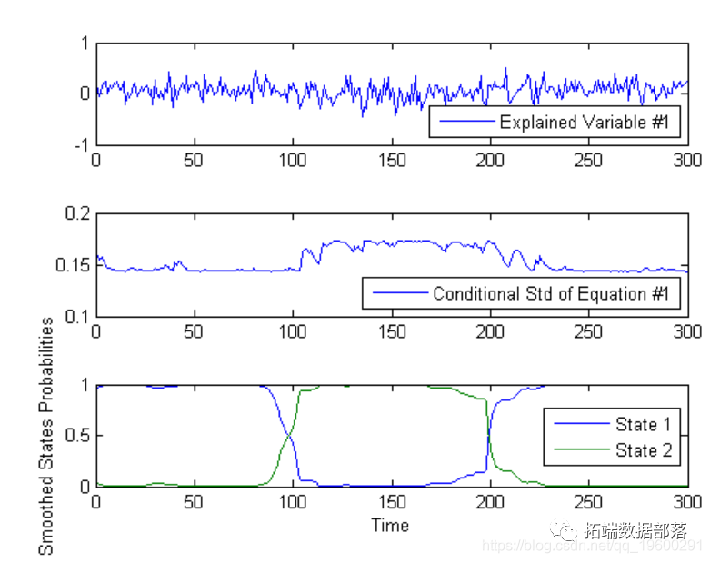 马尔可夫区制转移(Markov regime switching)模型旨在阐明这些类型的问题。它将以上收益序列视为 由马尔可夫过程控制的 状态(区制)转移模型(MRS),以在状态之间进行转移。代码: