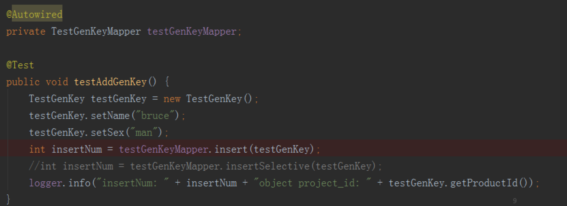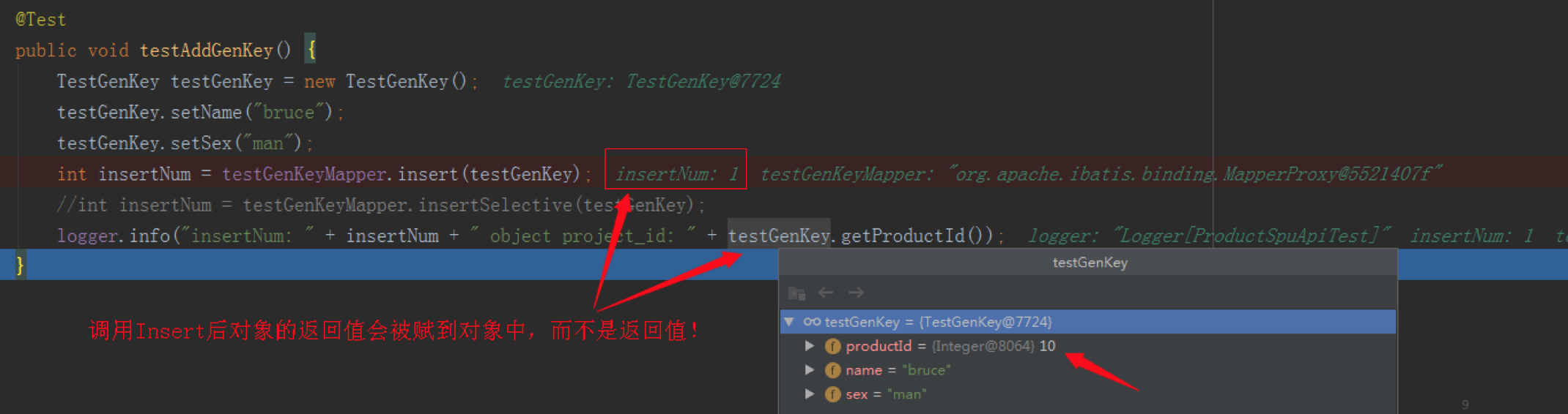 终于凭借着一次Debugg发现的问题,原来在使用Mabatis中的insert或者insertSelective方式插入时,如使用int insert(TestGenKey testGenKey)时,返回值int表示的是插入操作受影响的行数,而不是指的自增长id,那么返回的自增id到底去哪里了呢?通过下面的Debugg我们知道自增id返回到testGenKey的原对象中去了。