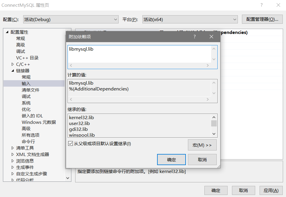4.将mysql安装文件夹中lib目录中的libmysql.lib文件添加到依赖项中。