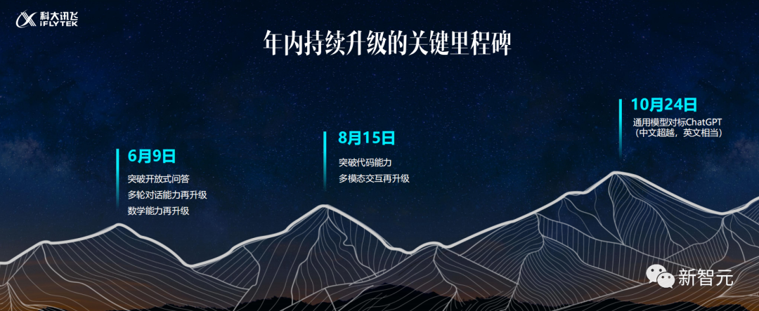 第一阶段:6月9日,突破开放式问答,多轮对话、数学能力加强;第二阶段:8月15日,代码能力提升,多模态交互能力开放给客户;第三阶段:10月24日,星火在中文通用能力超过ChatGPT,英文能做到相当水平。