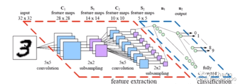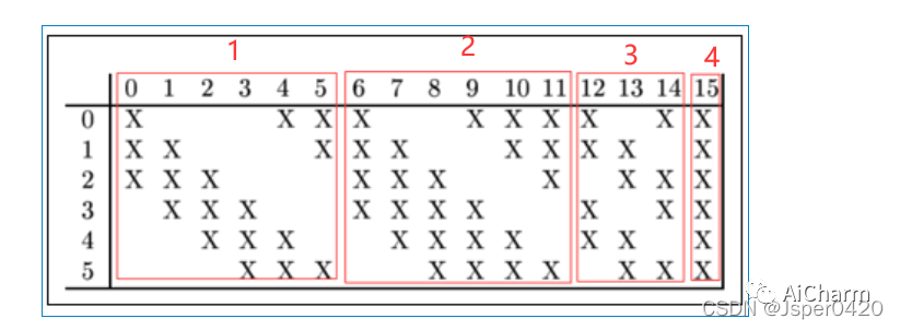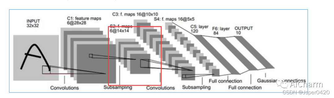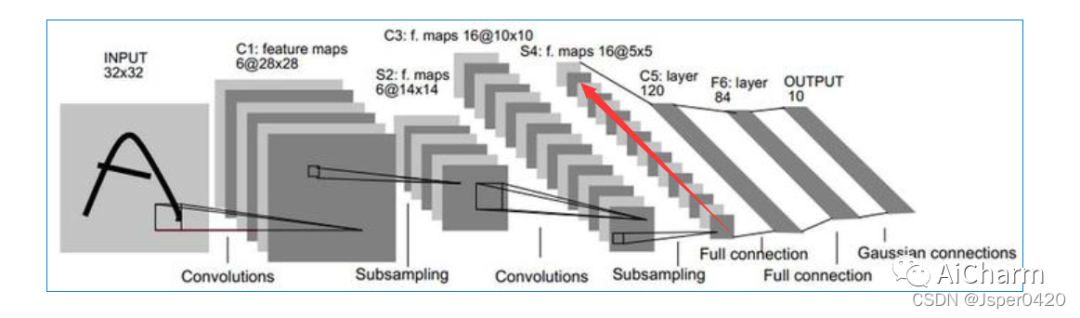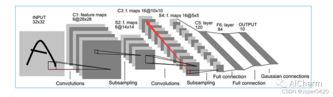 C3的前6个feature map(上图红框1的6列)与S2层相连的3个feature map相连接(上图红框1的某相邻的3行),后面6个feature map(上图红框2的6列)与S2层相连的4个feature map相连接(上图红框2的某相邻的4行),后面3个feature map(上图红框3的3列)与S2层部分不相连的4个feature map(上图红框3的某不相邻的4行)相连接,最后一个(上图红框4)与S2层的所有feature map(上图红框4的所有行)相连。
