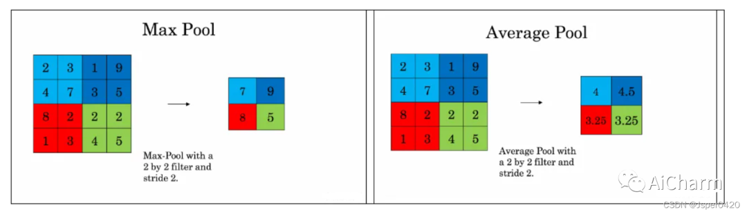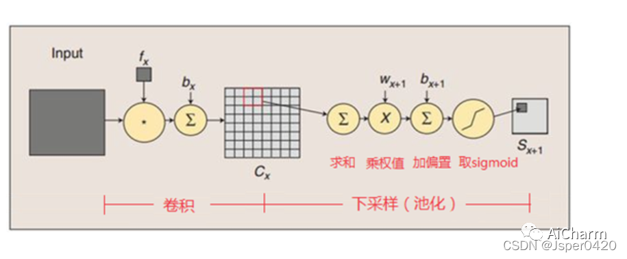 池化层的作用是特征映射(特征降维)。如果池化单元为2×2,6个特征图的大小经池化后从28×28变为14×14。为什么池化后大小减半?因为在本文的池化单元之间没有重叠(有的时候池化单元会重叠),在池化区域内进行聚合统计后得到新的特征值,因此经2×2池化后,每两行两列重新算出一个特征值出来,相当于图像大小减半,因此卷积后的28×28图像经2×2池化后就变为14×14。 池化层的计算过程:2×2 单元里的值相加,然后再乘以训练参数w,再加上一个偏置参数b(每一个特征图共享相同的w和b),然后取sigmoid值(S函数:0-1区间),作为对应的该单元的值。