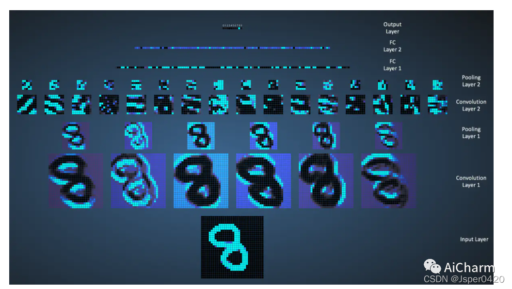 如标准的手写体0,1,2,3等,那么最后一层就说明。F6层和标准的作比较,和标准的那个图形越相似就说明就越是那个字符的可能性更大。我们看看标准的是什么样的: