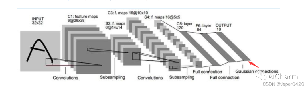 第六层是全连接层。F6层有84个节点,对应于一个7x12的比特图,-1表示白色,1表示黑色,这样每个符号的比特图的黑白色就对应于一个编码。该层的训练参数和连接数是(120 + 1)x84=10164。