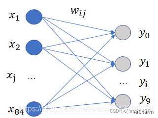 Output层也是全连接层,共有10个节点,分别代表数字0到9。如果第i个节点的值为0,则表示网络识别的结果是数字i。采用的是径向基函数(RBF)的网络连接方式。假设x是上一层的输入,y是RBF的输出,则RBF输出的计算方式是: