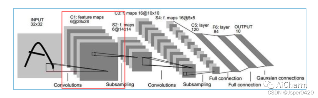 LeNet网络总共有六层网络(不包含输入输出层)。第一层是卷积层(图中C1层):