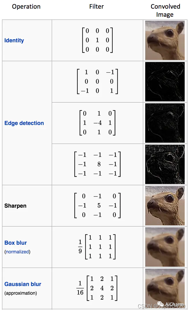 卷积的作用主要是:通过卷积运算,可以使原信号特征增强,降低噪音。在图像上卷积之后主要是减少图像噪声,提取图像的特征。 卷积网络能很好地适应图像的平移不变性:例如稍稍移动一幅猫的图像,它仍然是一幅猫的图像。卷积操作保留了图像块之间的空间信息,进行卷积操作的图像块之间的相对位置关系没有改变。图像在不同卷积核上进行卷积之后的效果图如下: