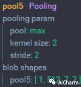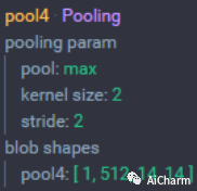 POOL4层 :池化大小为 2x2,步长为 2 9. 输入:14×14×512 大小的图像 10. 尺寸:(14-2)/2+1 =7 11. 池化层个数:512 12. 输出尺寸:7x7x512
