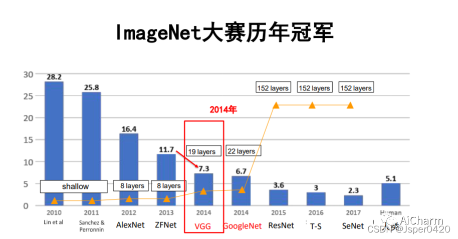 VGGNet是在ImageNet Challenge 2014在定位和分类过程中分别获得了第一名和第二名的神经网络架构。VGGNet是牛津大学计算机视觉组和DeepMind公司的研究员一起研发的深度卷积神经网络。VGG主要探究了卷积神经网络的深度和其性能之间的关系,通过反复堆叠3×3的小卷积核和2×2的最大池化层,VGGNet成功的搭建了16-19层的深度卷积神经网络。与之前的网络结构相比,错误率大幅度下降;同时,VGG的泛化能力非常好,在不同的图片数据集上都有良好的表现。到目前为止,VGG依然经常被用来提取特征图像。自从2012年AlexNet在ImageNet Challenge大获成功之后,深度学习在人工智能领域再次火热起来,很多模型在此基础上做了大量尝试和改进。主要有两个方向: