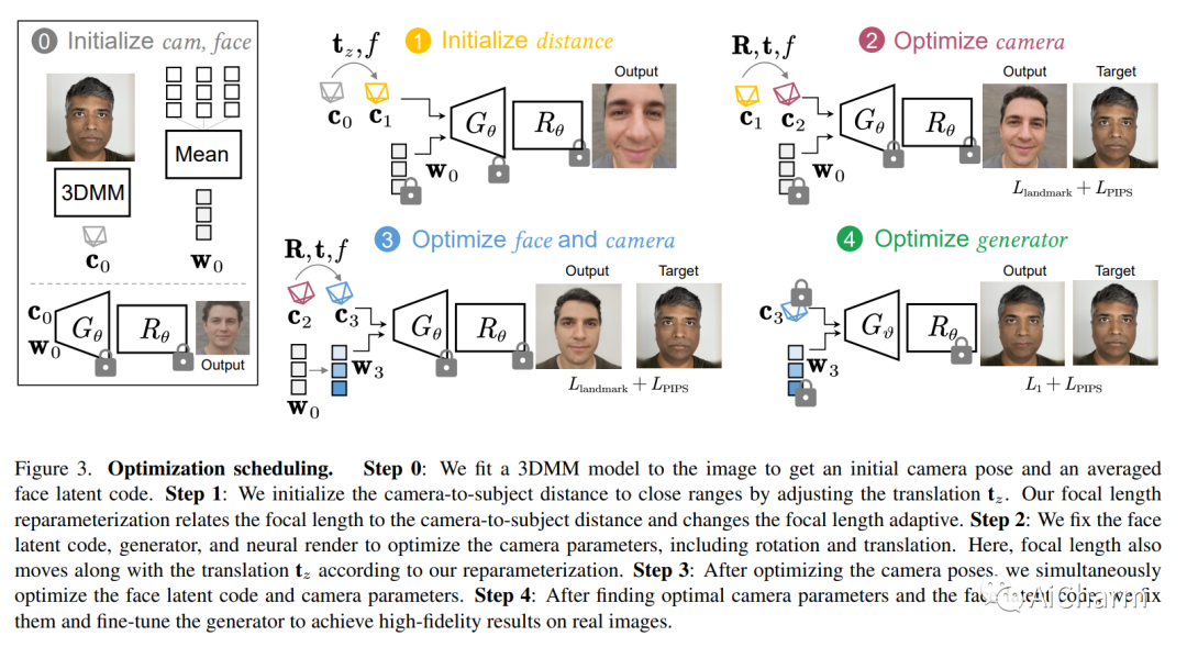 在近距离拍摄的特写面部图像通常会出现透视失真,导致夸张的面部特征和不自然/不吸引人的外观。我们提出了一种简单而有效的方法来校正单个特写脸部中的透视失真。我们首先通过联合优化相机内部/外部参数和面部潜在代码,使用透视扭曲的输入面部图像执行 GAN 反演。为了解决联合优化的模糊性,我们开发了焦距重新参数化、优化调度和几何正则化。以适当的焦距和相机距离重新渲染肖像可以有效地纠正这些失真并产生更自然的效果。我们的实验表明,我们的方法在视觉质量方面优于以前的方法。我们展示了许多示例,以验证我们的方法在野外人像照片上的适用性。