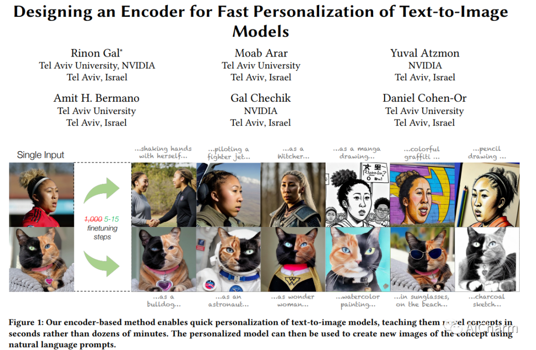 文本到图像的个性化旨在教授预训练的扩散模型来推理新颖的、用户提供的概念,并将它们嵌入到由自然语言提示引导的新场景中。然而,当前的个性化方法与冗长的训练时间、高存储要求或身份丢失作斗争。为了克服这些限制,我们提出了一种基于编码器的域调整方法。我们的主要见解是,通过欠拟合来自给定领域的大量概念,我们可以提高泛化能力并创建一个更适合快速添加来自同一领域的新概念的模型。具体来说,我们采用了两个组件:首先,一个编码器,它将来自给定域的目标概念的单个图像作为输入,例如一个特定的面孔,并学习将其映射到表示该概念的词嵌入中。其次,一组用于文本到图像模型的正则化权重偏移,学习如何有效地摄取额外的概念。这些组件共同用于指导未知概念的学习,使我们能够仅使用一张图像和少至 5 个训练步骤来个性化模型——将个性化从几十分钟加速到几秒钟,同时保持质量。