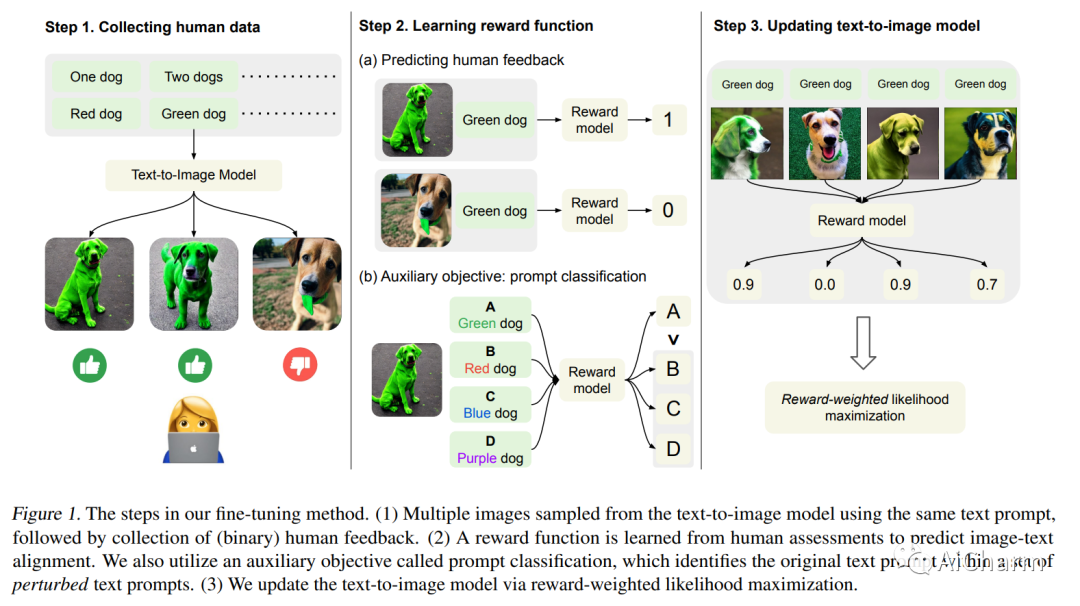 深度生成模型在文本到图像合成方面取得了令人瞩目的成果。然而,当前的文本到图像模型通常会生成与文本提示不充分对齐的图像。我们提出了一种使用人类反馈来对齐此类模型的微调方法,包括三个阶段。首先,我们从一组不同的文本提示中收集评估模型输出对齐的人类反馈。然后,我们使用人工标记的图像文本数据集来训练预测人类反馈的奖励函数。最后,文本到图像模型通过最大化奖励加权似然来改进图像文本对齐进行微调。我们的方法比预训练模型更准确地生成具有指定颜色、计数和背景的对象。我们还分析了几种设计选择,发现对此类设计选择进行仔细调查对于平衡对齐保真度权衡非常重要。我们的结果证明了从人类反馈中学习以显着改进文本到图像模型的潜力。