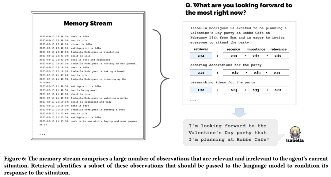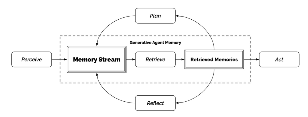 由于 Generative Agents 会产生大量必须保留的事件和记忆流(memory stream),因此其架构的核心挑战是确保在需要时检索和合成智能体记忆中最相关的部分。