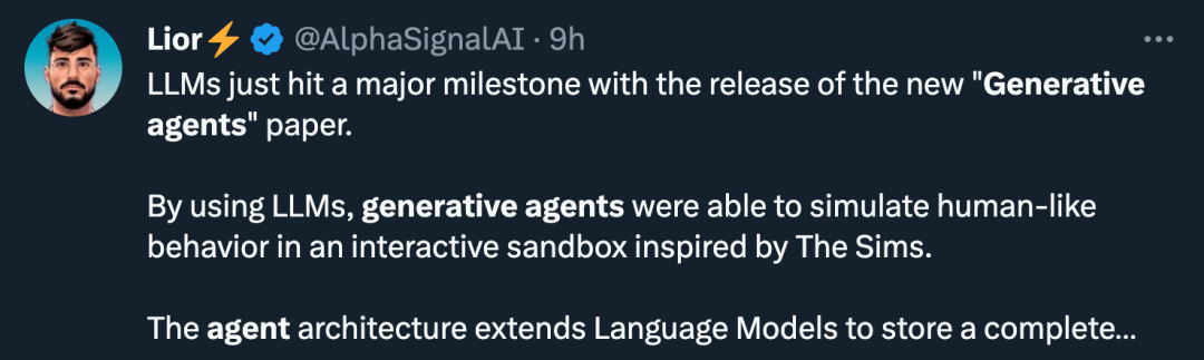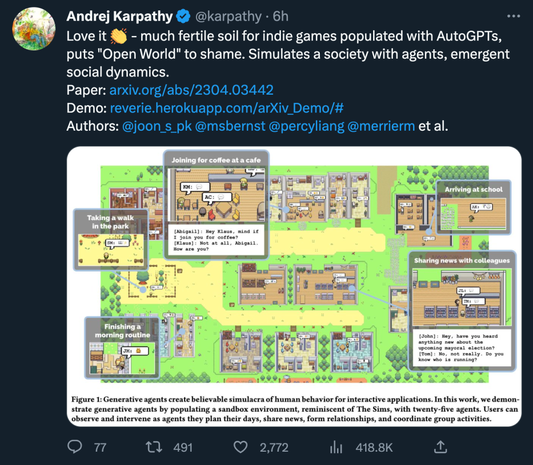 文章一经发布,就引起了全网的热议。本就看好「AutoGPT」方向的 Karpathy 连连赞叹,认为「Generative Agents」比之前玩概念的「Open World」高了不是一点半点: