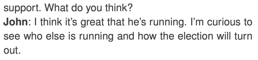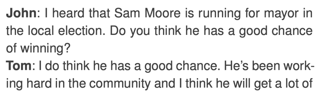 当天晚些时候,在 Sam 离开后,从另一个渠道听到消息的 Tom 和 John 讨论了 Sam 赢得选举的机会: