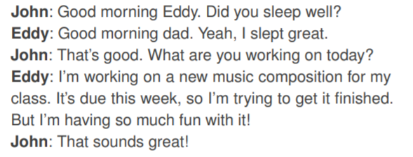 在这个家庭中,John Lin 早上七点第一个起床,然后刷牙、洗澡、穿衣服、吃早餐,接着在客厅的餐桌旁浏览新闻。早上 8 点,John Lin 的儿子 Eddy 也跟着起床准备上课。他临出门时和 John 进行对话,内容为: