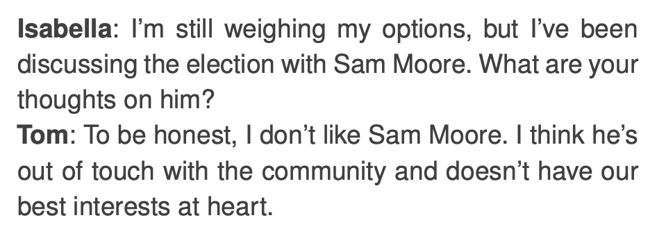 渐渐地,Sam 的候选资格成为了镇上的话题,有人支持他,也有人犹豫不决。