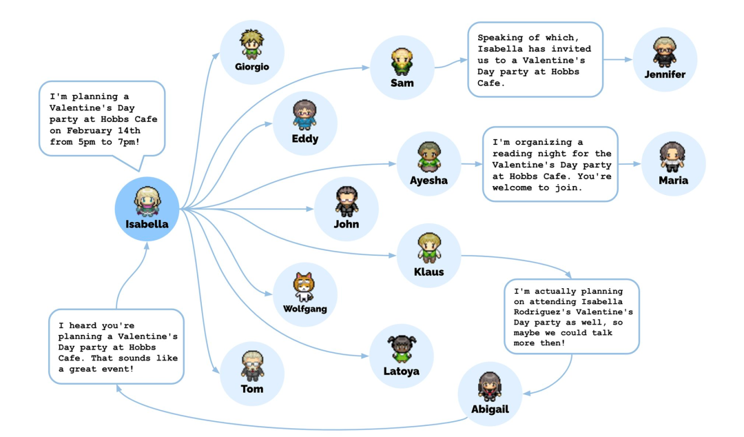 比如,伊莎贝拉计划举办一场情人节派对。她传播了这个信息,在模拟结束时,12 个角色已经知道了这件事。其中 7 个人「犹豫不决」——3 个人已有其他计划,4 个人没有表露想法,这和人类的相处一样。