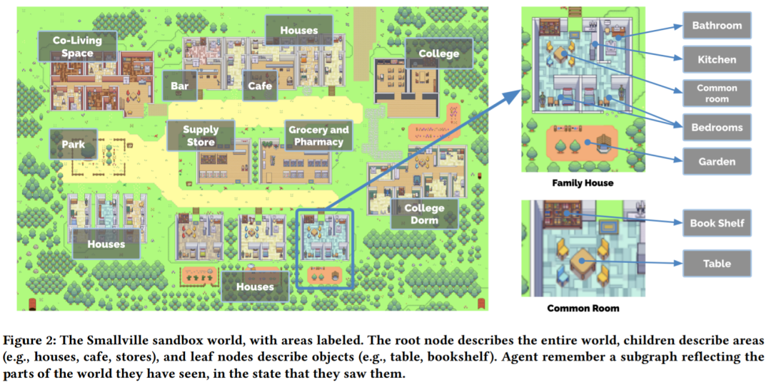 Smallville 小镇有许多公共场景,包括咖啡馆、酒吧、公园、学校、宿舍、房屋和商店。此外,每个公共场景还包括自身具有的功能以及对象,例如房子中有厨房、厨房中有炉子 (图 2)。在智能体的生活空间中还有床、桌子、衣柜、架子,以及浴室和厨房。