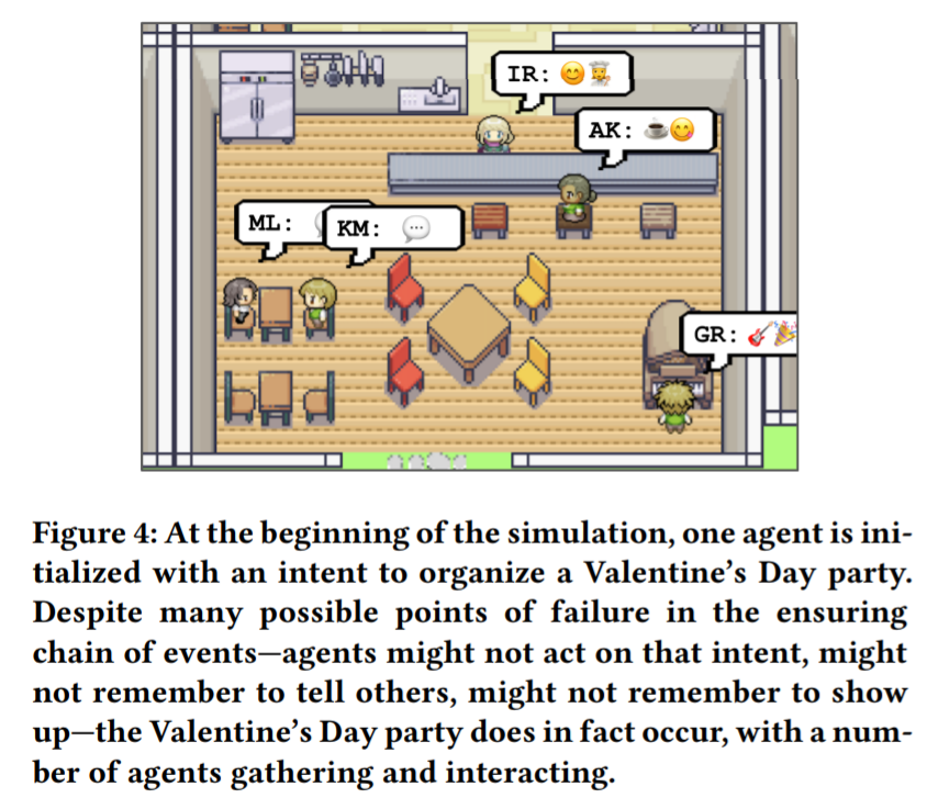 情人节那天,包括 Klaus 和 Maria 在内的五名智能体在下午 5 点出现在 Hobbs 咖啡馆,它们享受着庆祝活动(图 4)。在这个场景中,终端用户只设置了 Isabella 举办派对的初始意图和 Maria 对 Klaus 的迷恋:传播信息、装饰、约对方、到达派对以及在派对上互动的社交行为 ,由智能体架构发起。