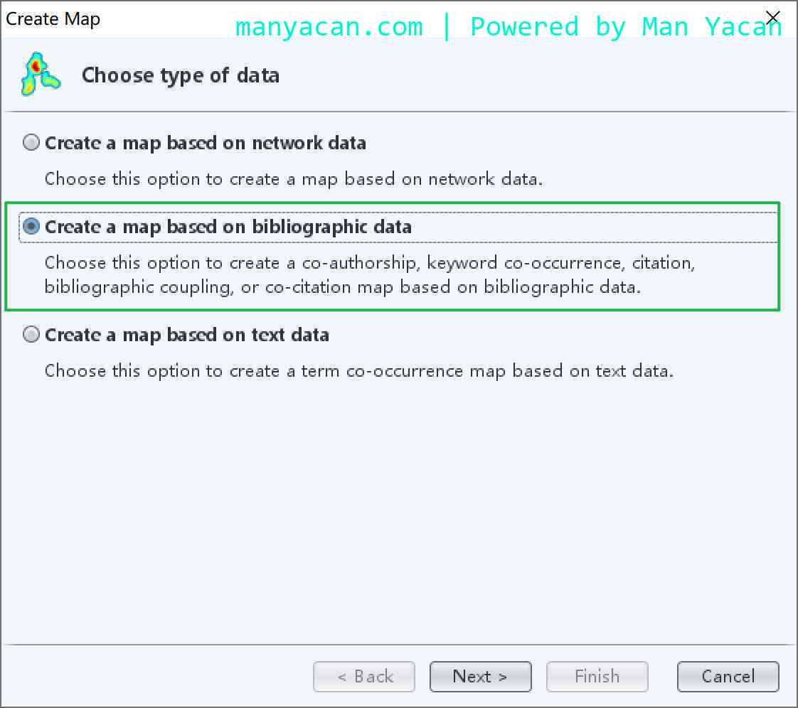 由于我们已经制作好了本地文件,所以选择第二项Greate a map based on bibliographic data。然后Next。