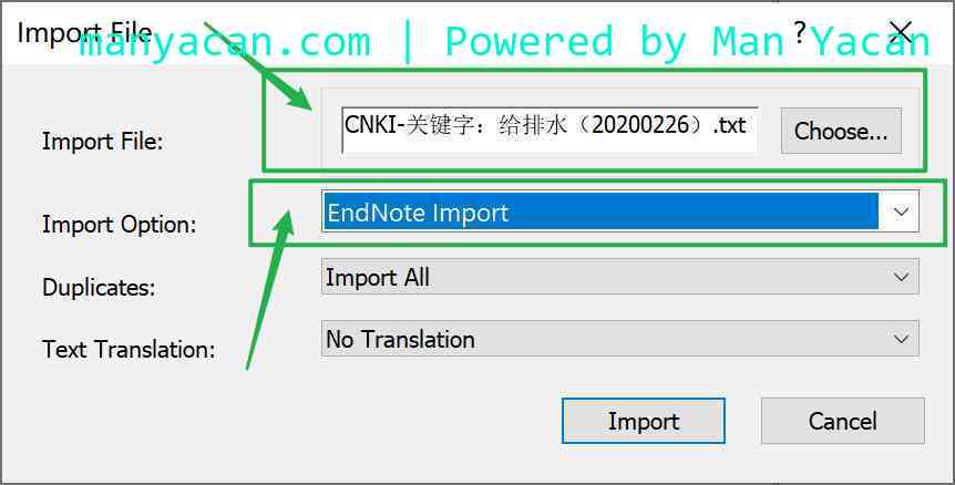 在空白项目中导入CNKI中下载的数据,步骤:File》Import》file。第一个框框中选择文件路径(在CNKI导出的以.txt结尾的文件),在第二个框框中选择 EndNoteImport,因为只有这样EndNote才知道这是它自己可以读取的文件。