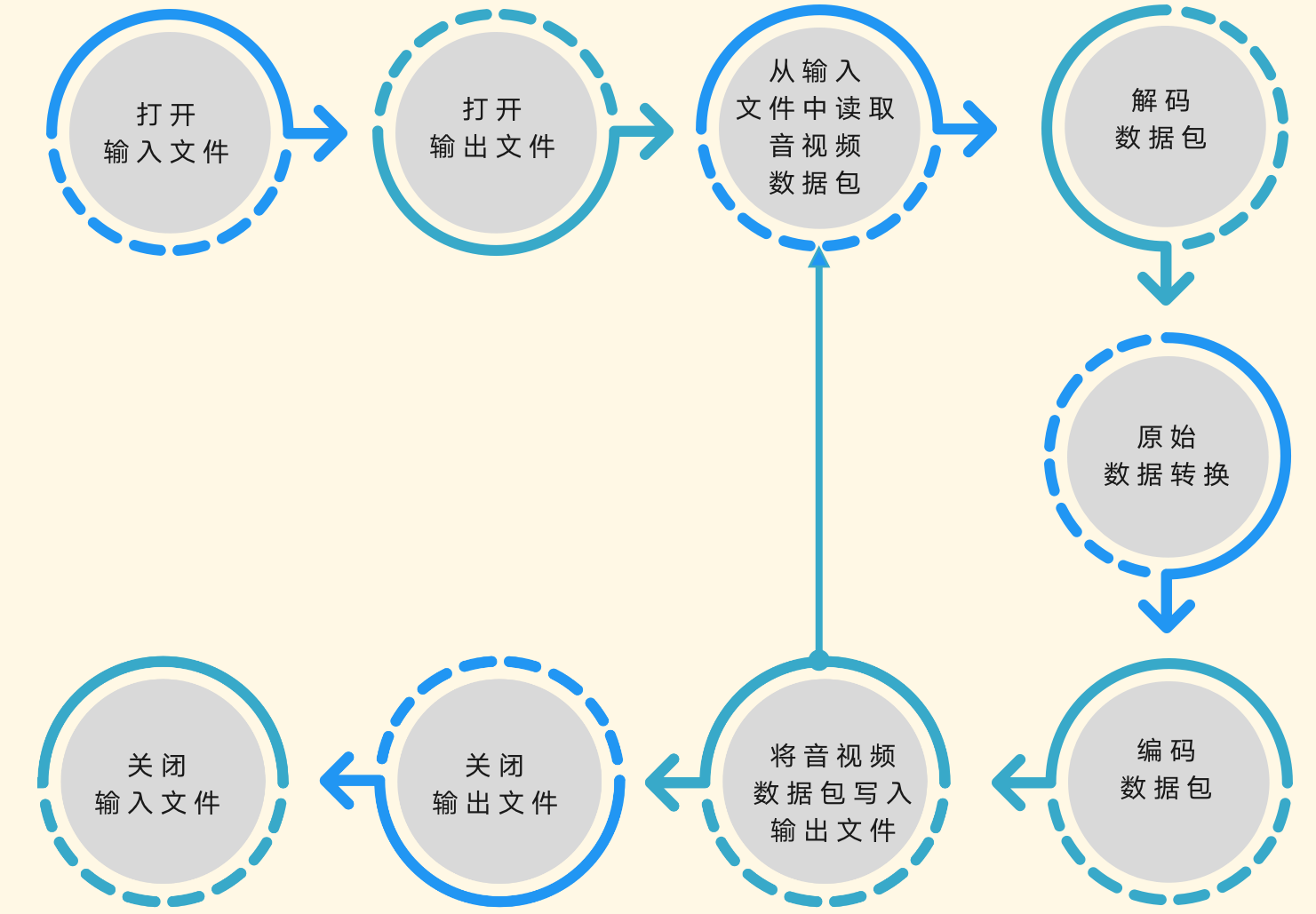 avformat_open_input、avformat_find_stream_info 来打开输入文件,并根据输入文件中的音视频流信息建立音视频流,也就是 AVStreams。avformat_alloc_output_context2、avformat_new_stream 和 avformat_write_header 打开输出文件,并建立音视频流,输出文件会用到 AVOutputFormat,并建立封装格式操作的 AVFormatContext,作为操作上下文的结构体,并且会尝试写入输出文件的封装格式头部信息。av_read_frame 函数,从输入文件中读取 AVPacket 音视频数据包,还会使用 av_interleaved_write_frame 函数,将读取到的音视频数据包写入输出文件。av_write_trailer 函数,在关闭输出文件之前做写封装收尾工作。使用 avformat_free_context 函数关闭输出文件,并释放因操作输出文件封装格式申请的资源。最后使用 avformat_close_input 关闭输入文件并释放相关的资源。日常操作时,做 remux 主要还是用于收录一些音视频内容的场景中,用得更多的还是编码或者转码的操作。因为音视频的编码数据格式比较多,需要统一转成相同的编码,即将输入的音视频内容转成统一规格输出的场景,比收录场景更常见。