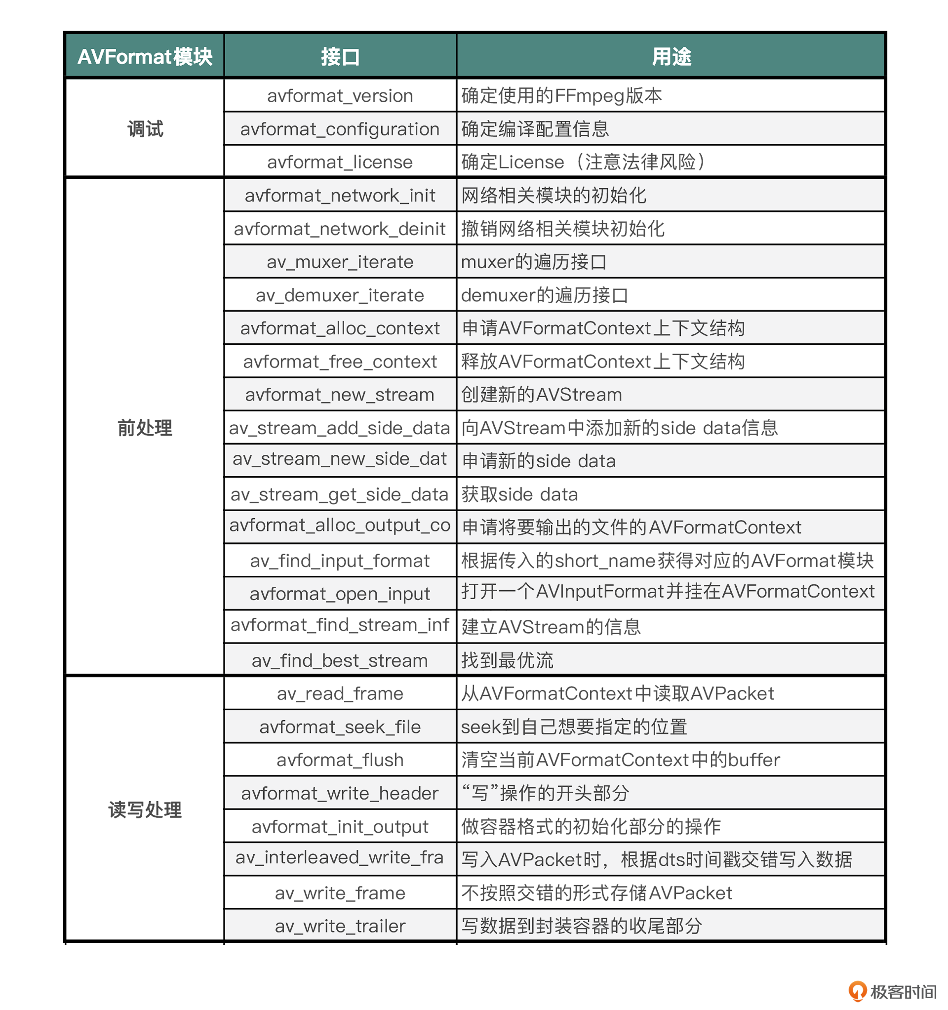 av_read_frame:从 AVFormatContext 中读取 AVPacketavformat_seek_file:在 AVFormatContext 中查找 AVPacket,如拖动进度条avformat_flush:清空 AVFormatContext 中的缓存avformat_write_header:主要用在“写”操作的开头部分,通常指传输协议的开始,写封装格式头部avformat_init_output:用来做容器格式初始化部分的操作,如打开文件,或者有一些容器格式内部的信息需要初始化的时候av_interleaved_write_frame:支持在写入 AVPacket 的时候,根据 dts 时间戳交错写入数据av_write_frame:不按照交错的形式存储 AVPacket,不过在写入文件的时候是直接写入到磁盘,不会有 bufferav_write_trailer:写数据到封装容器的收尾部分